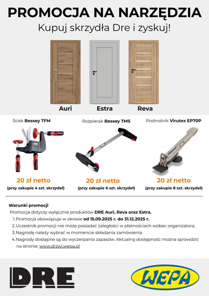 Od 15 września będzie obowiązywał nowy katalog DRE 2025/3. Wersja drukowana dostępna będzie końcem września, do tego czasu można korzystać z wersji elektronicznej online która będzie dostępna na stronie: httpshttps://wepa.pl/producent/drzwi-dre/